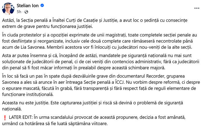 Inalta Curte de Casatie si Justitie a dezmintit vineri seara, 12 decembrie 2025, informatiile privind o decizie de desfiintare si reorganizare a completurilor de judecata in materia penala. Informatii propagate inclusiv de fostul ministru USR al Justitiei, deputatul Stelian Ion (foto), unul dintre cei mai vehementi contestatari ai actualilor sefi ai Justitiei.