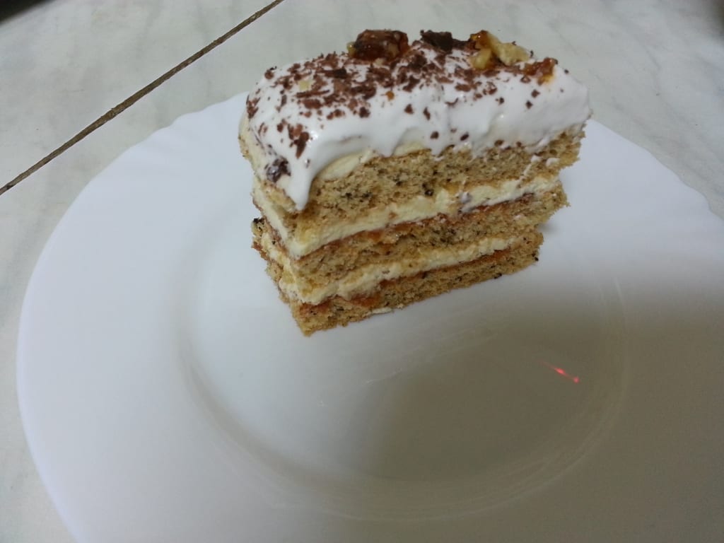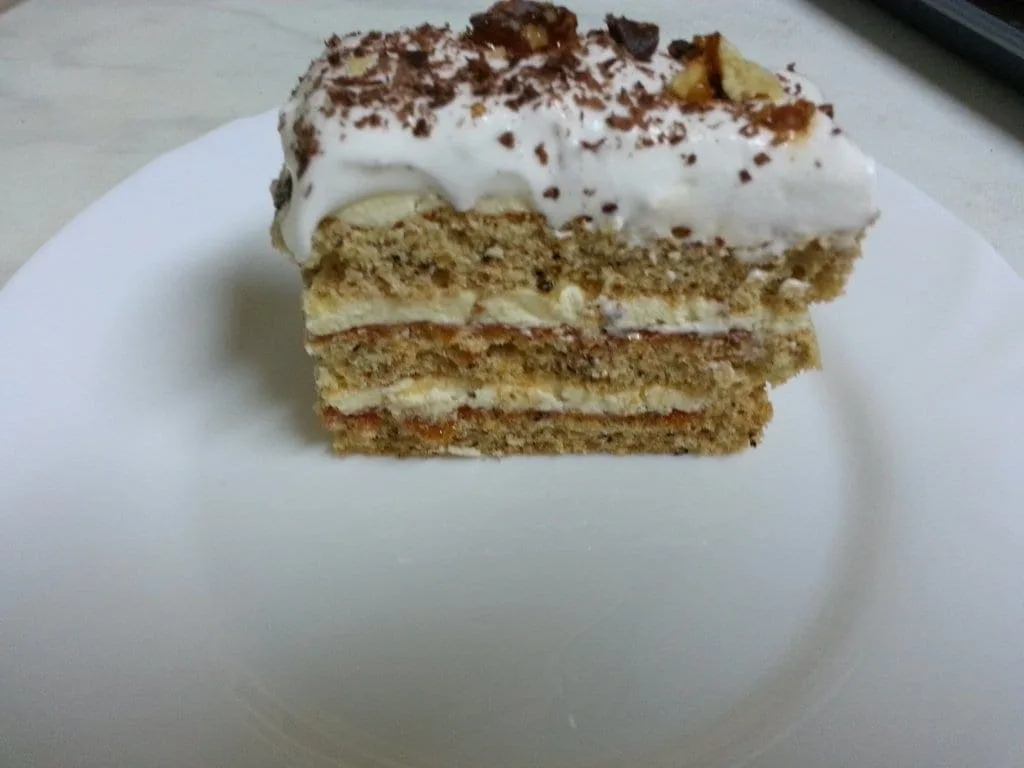Mod de preparare: Se bat albuşurile cu zahărul adăugat treptat api se adăugă cele 3 linguri de apă rece şi se bat in continuare. Separat gălbenuşurile se amestecă cu bicarbonatul stins la care se adăugă cele 3 linguri de nucă măcinată şi cele 5 linguri de făină se omogenizează, pentru a fi mai fluid a compoziţia se pun 2 linguri de albuş spumă apoi încet cu ajutorul unui tel se încorporează tot albuşul.Se tapetează o tavă şi se dă la cuptor la 160 grade.Se mai coc încă două foi după acelaşi procedeu.