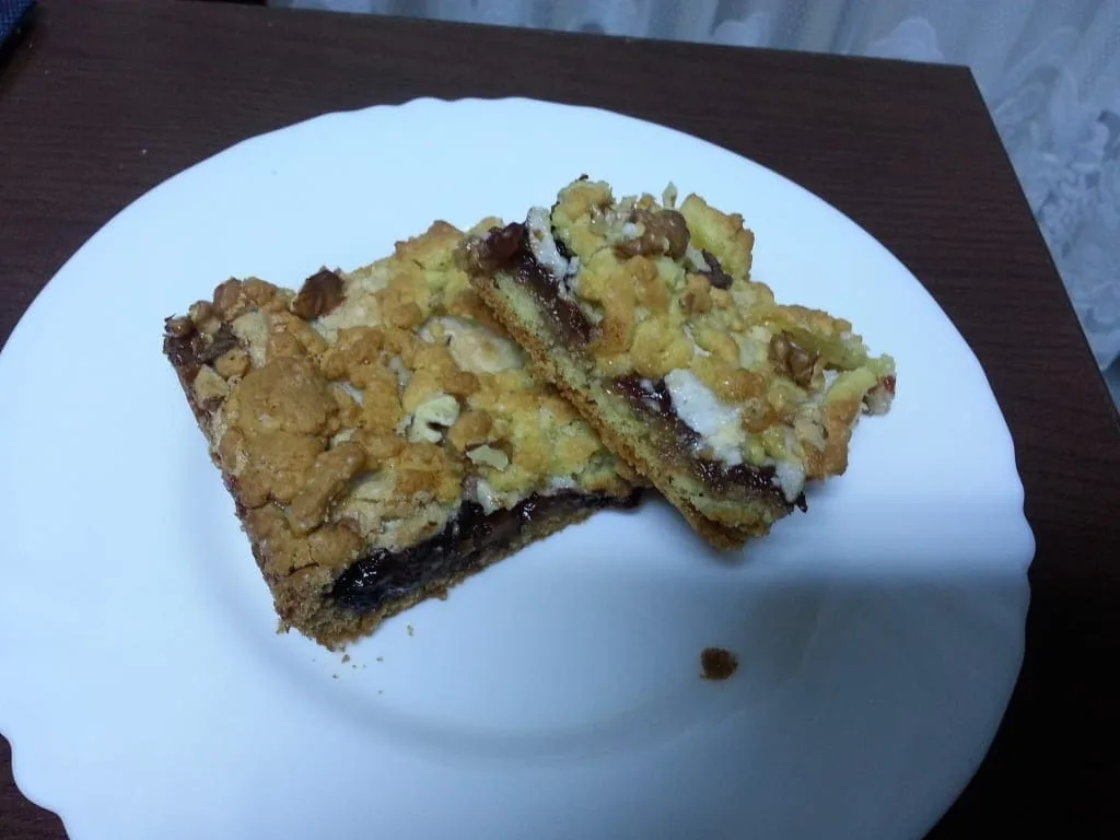 Untură se freacă cu făină şi zahărul apoi se adăugă gălbenuşurile, laptele bicarbonatul stins şi se frământă un aluat omogen care se împarte în două. Din prima parte se întinde o foaie care se pune într-o tavă unsă şi tapetata cu făină peşte se adăugă gemul apoi albuşurile bătute cu zahăr deasupra se râde cealaltă parte de aluat iar peste se adăugă nucile tocate. Cuptorul se încălzeşte la 180 se pune prăjitura şi se lasă până devine aurie deasupra. Când este gata se scoate din cuptor şi se lasă la răcit.Se porţionează şi se pudrează cu zahăr.