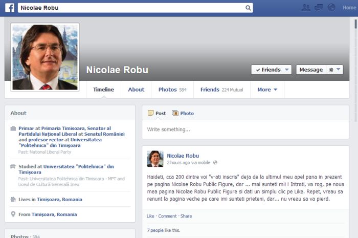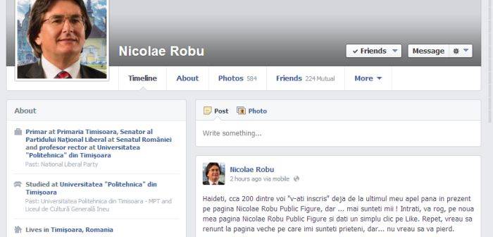 „Haideti, cca 200 dintre voi <<v-ati inscris>> deja de la ultimul meu apel pana in prezent pe pagina Nicolae Robu Public Figure, dar … mai sunteti mii ! Intrati, va rog, pe noua mea pagina Nicolae Robu Public Figure si dati un simplu clic pe Like. Repet, vreau sa renunt la pagina veche pe care imi sunteti prieteni, dar… nu vreau sa va pierd”, a scris Robu pe Facebook. Din nefericire pentru utilizatorul de Fb Nicolae Robu, doar cativa „prieteni” i-au dat Like.