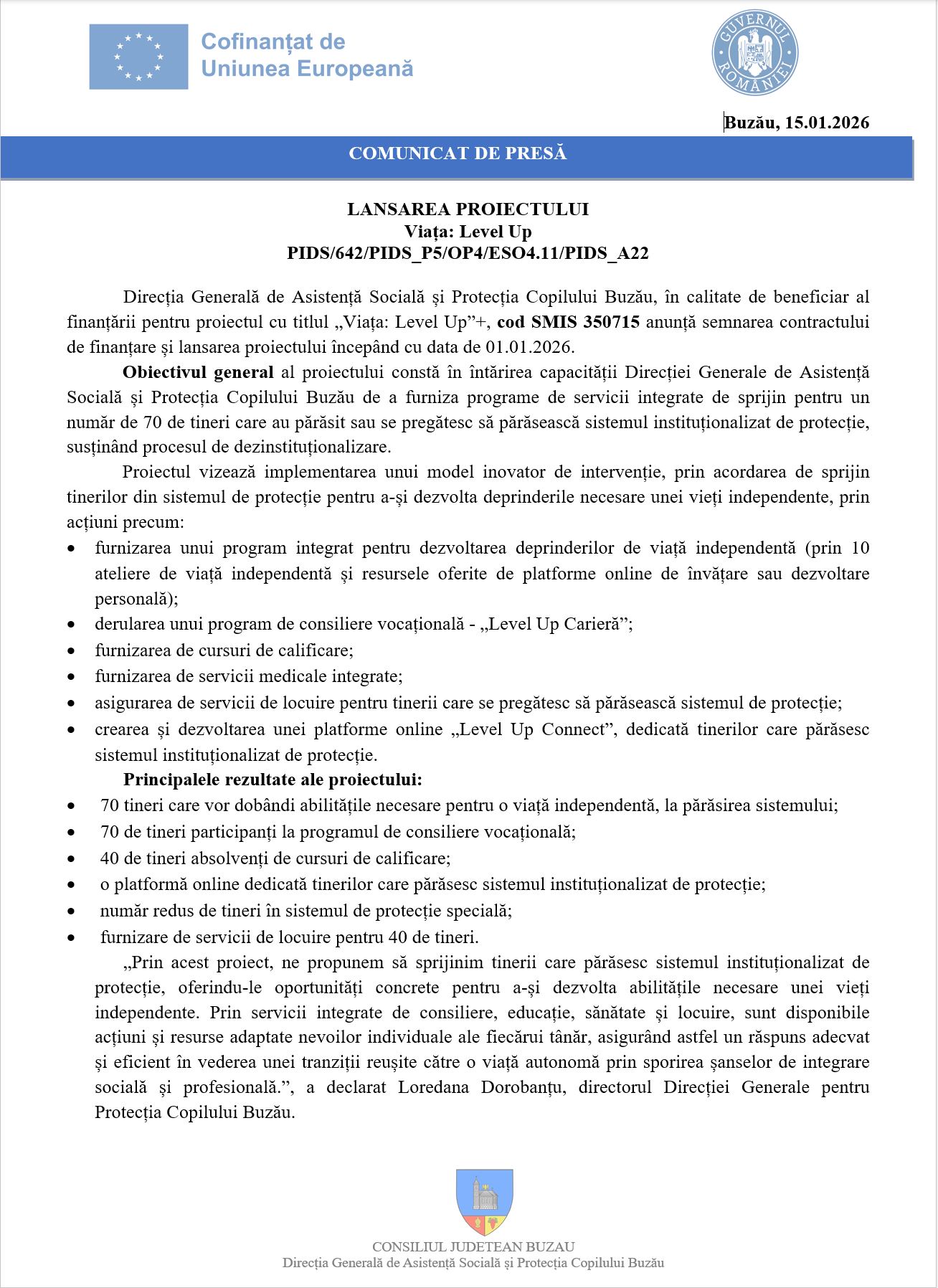 ANUNTURI BUZAUCOMUNICATE DE PRESASTIRI BUZAU DGASPC Buzău – COMUNICAT DE PRESĂ 16 ianuarie 2026deStiri Buzau Media DISTRIBUIE Stiri Buzau Media16 ianuarie 202616 ianuarie 2026 Articolul anteriorCompania de Apă Buzău: se întrerupe furnizarea apei în Buzău, în data de 19.01.2026 Buzăumedia pe Facebook Ultimele știri Compania de Apă Buzău: se întrerupe furnizarea apei în Buzău, în data de 19.01.2026 ADMINISTRATIVANUNTURI BUZAUSTIRI BUZAU Ziua Culturii Naționale a fost marcată la Teatrul „George Ciprian” Buzău printr-un eveniment dedicat valorilor culturii românești CULTURASTIRI BUZAU Buzoienii, așteptați la prima rundă de audiențe din acest an, la Avocatul Poporului! STIRI BUZAU Pietonii, în atenția polițiștilor buzoieni! STIRI BUZAU Reforma lui Bolojan pune pe liber 186 de polițiști locali din Buzău! STIRI BUZAU Metalul Buzău a bifat primul transfer al iernii! STIRI BUZAU Evenimente dedicate Zilei Culturii Naționale, organizate azi la Teatrul „George Ciprian” Buzău CULTURASTIRI BUZAU Rodica Bârlă: INFORMARE –PLATA TAXELOR ȘI IMPOZITELOR LOCALE 2026 STIRI BUZAU De anul școlar viitor, dispar 24 de clase a IX-a, de la liceele din județ! STIRI BUZAU ”Super-gripa”, în atenția autorităților sanitare buzoiene! STIRI BUZAU