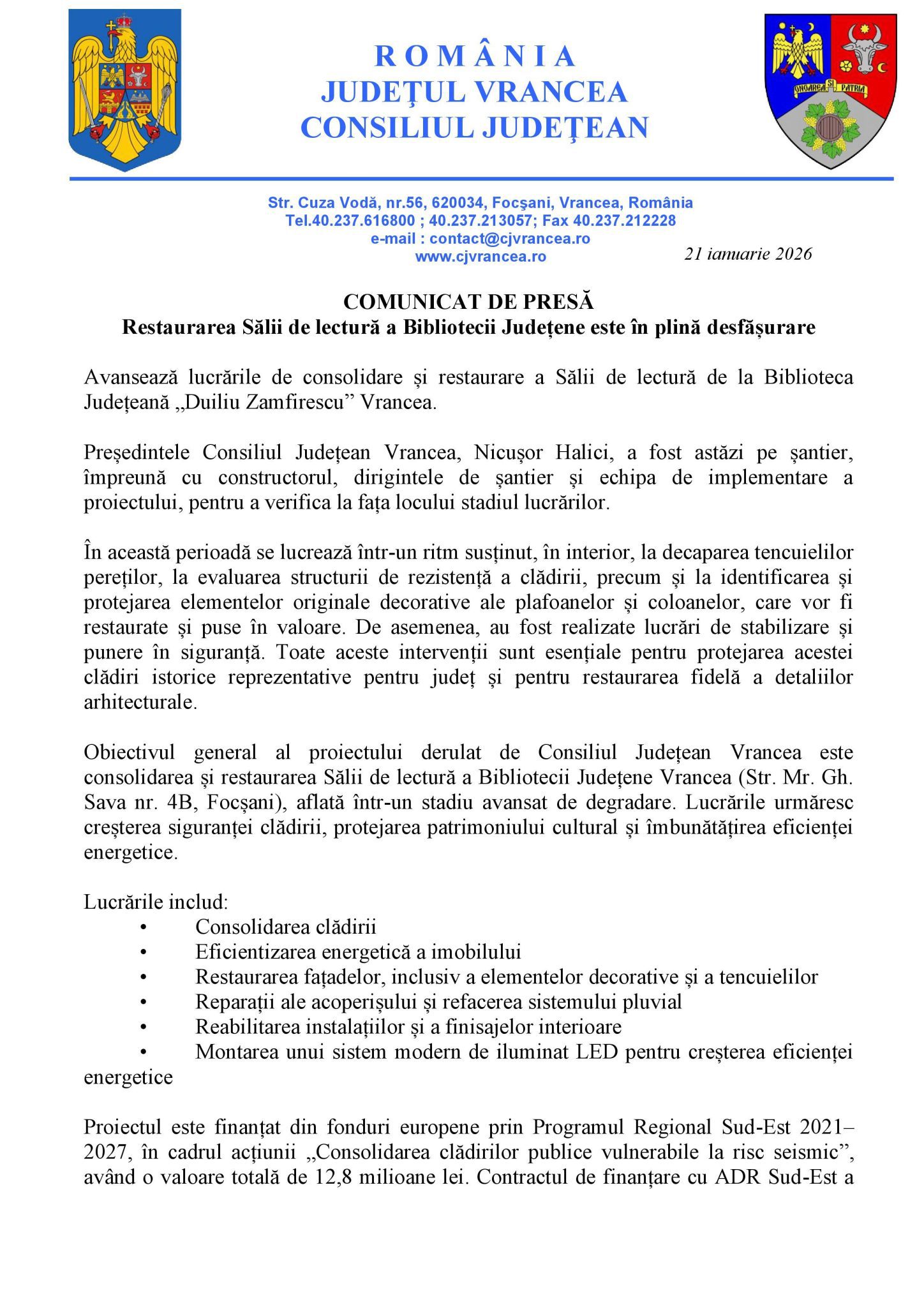 Citiți și conținutul integral al comunicatului de presă făcut public miercuri 21 ianuarie 2026 ora 16:05 de Biroul de Presă al Consiliului Judetean Vrancea în legătură cu această știre