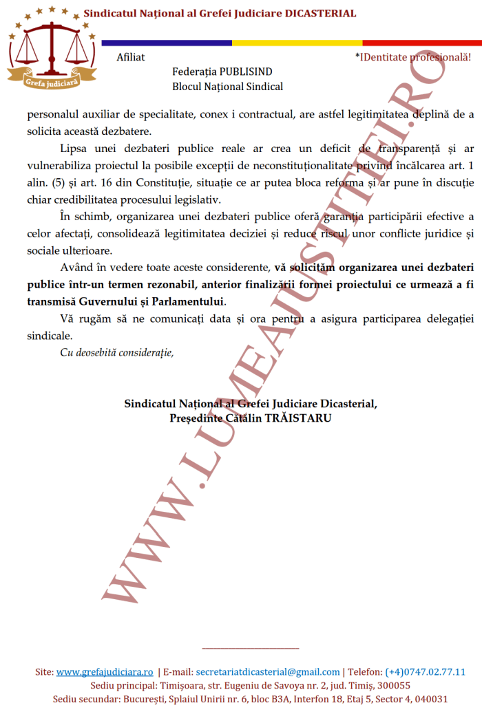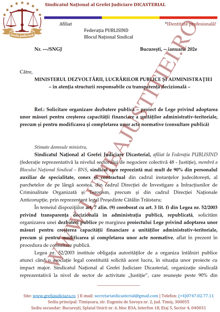 Legea nr. 52/2003 instituie obligația autorităților de a organiza întâlniri publice atunci când o asociație legal constituită solicită acest lucru, în situația unor proiecte cu impact major. Sindicatul Național al Grefei Judiciare Dicasterial, organizație sindicală reprezentativă la nivel de sector de activitate „Justiție”, care reunește peste 90% din personalul auxiliar de specialitate, conex i contractual, are astfel legitimitatea deplină de a solicita această dezbatere.