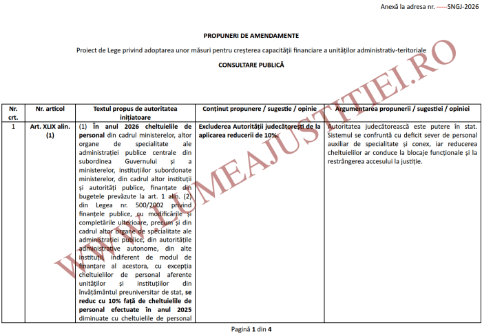 De aceea, SNGJ Dicasterial cere ministerului să excludă autoritatea judecătorească din proiectul de lege. În caz contrar, Executivul va arunca în haos justiția română, provocând un blocaj imens în instanțele și parchetele românești. Aceasta cu atât mai mult, cu cât numeroase instanțe și parchete funcționează deja la cote de avarie, subliniază sindicaliștii.