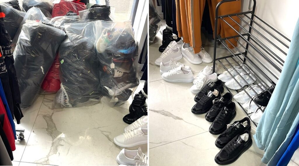 IMAGINI. Chinezării cu etichete de „haine de firmă”, confiscate în Râmnicu Vâlcea. DOSAR PENAL