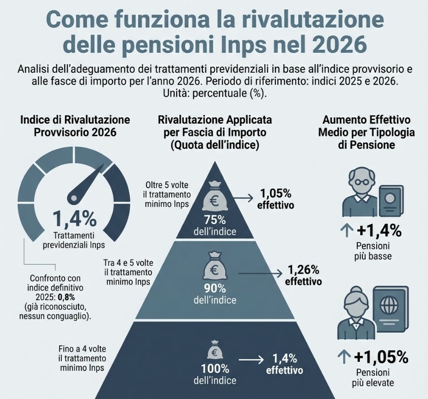 Per il 2026 l’indice di rivalutazione provvisorio è fissato al +1,4%. L’adeguamento viene applicato secondo il meccanismo a fasce già in vigore: rivalutazione piena al 100% per i trattamenti fino a quattro volte il minimo Inps, ridotta al 90% tra quattro e cinque volte il minimo e al 75% oltre tale soglia. In termini pratici, l’aumento effettivo varia dall’1,4% per le pensioni più basse fino all’1,05% per quelle più elevate.