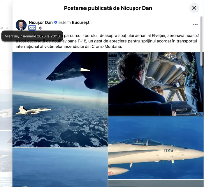 La întoarcerea de la Paris, Nicușor Dan a transmis pe social-media că aeronava Spartan în care se afla a fost escortată de două avioane ale Forțelor Aeriene Elvețiene și a publicat chiar și fotografii. Numai că, președintele Dan a și plusat: a spus că Elveția a făcut acest gest în semn de „recunoștință” față de ajutorul acordat de România cu transportul persoanelor rănite în tragedia din barul Constelalltion, în Crans Montana.