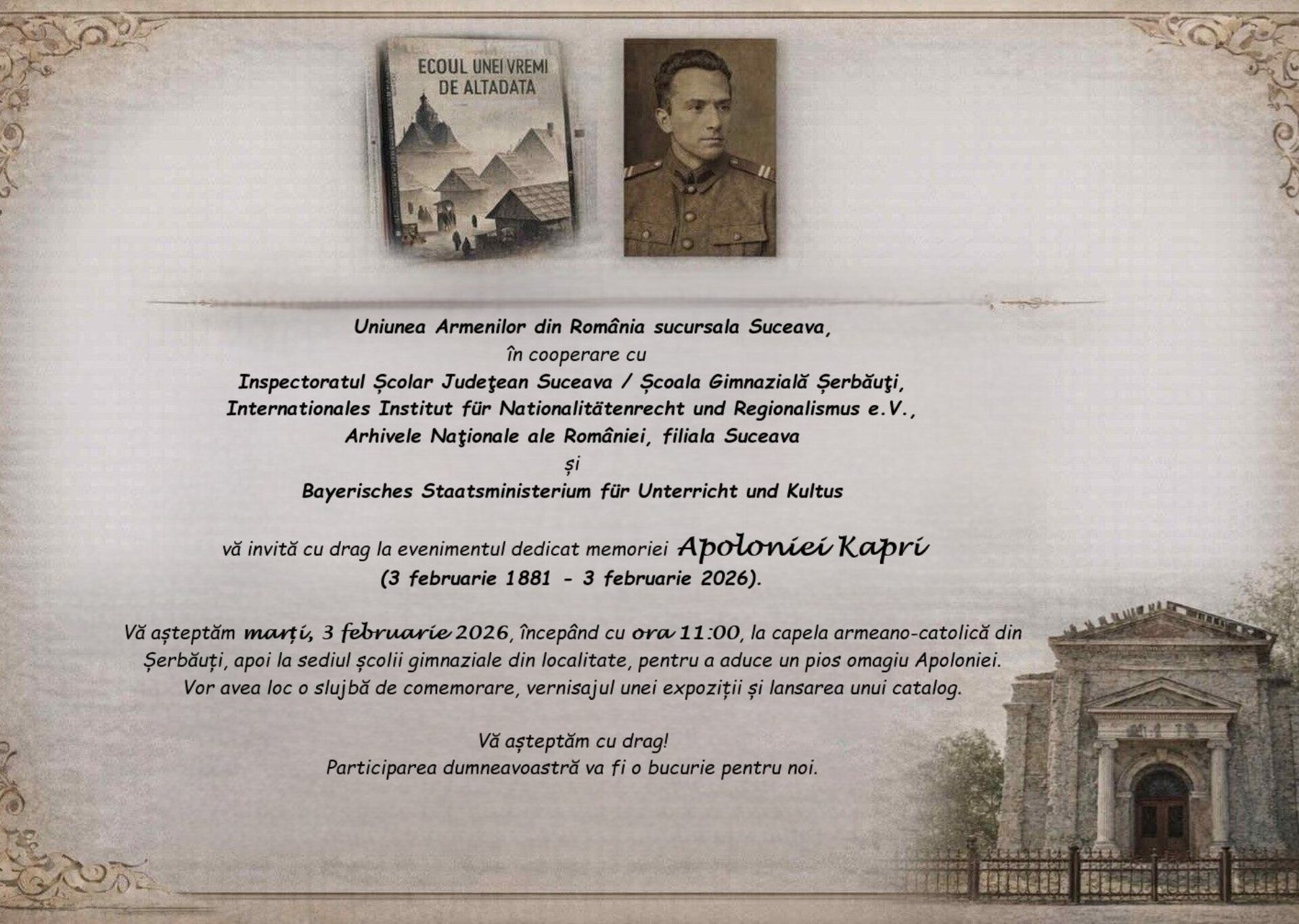 Uniunea Armenilor din România, Sucursala Suceava, în colaborare cu Inspectoratul Școlar Județean Suceava – Școala Gimnazială Șerbăuți, Internaționales Institut fur Nationalitatenrescht und Regionalismus e.V., Arhivele Naționale Ale României, Filiala Suceava, și Bayerisches Staatsministreium fur Unterricht und Kultus, organizează marți, 3 februarie 2026, începând cu ora 11:00, la Capela armeano-catolică Kapri din Șerbăuți, evenimentul cultural dedicat memoriei Apolloniei Kapri, soția lui Michael Kapri, la împlinirea a 145 de ani de la trecerea ei la cele veșnice, pe 3 februarie 1881.