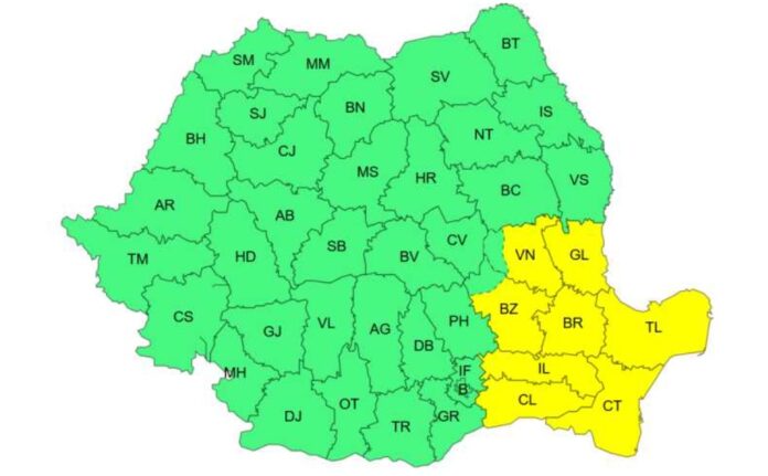 Județele vizate de atenționare sunt: Vrancea, Galați, Buzău, Brăila, Ialomița, Călărași, Tulcea și Constanța.