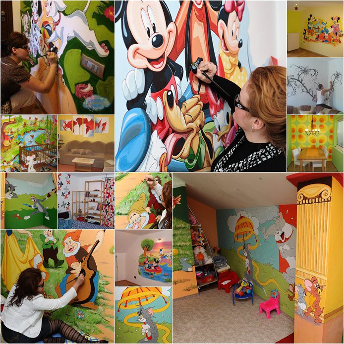 Andreea Nasoi, din Iasi, poate crea un univers al copilariei in orice camera de prichindel. Andreea vine chiar si la Timisoara sa faca o familie fericita, iar taxele pentru transport le suporta din propriul buzunar. Loredana Ghera, din Resita, realizeaza si ea astfel de picturi. „Cel mai mult sper sa va incante ochiul cele realizate direct pe perete. Cele mai multe dintre acestea le fac pentru copii. Fiindca de doi ani si jumatate am devenit si eu mamica si stiu ce inseamna fericirea baietelului meu, incantarea de a se trezi in fiecare dimineata zambindu-i personajului din fata sa. Mai mult, somnul vegheat de aceste personaje de desene animate este mai linistit, cu vise pe masura”, isi descrie Loredana meseria.