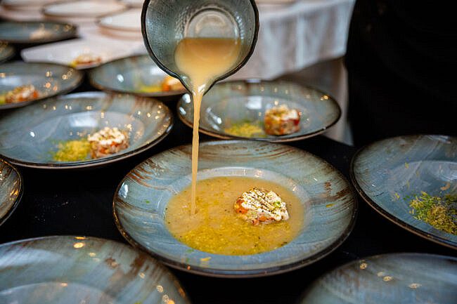 Ciorbăciocăneșteană cu păstrăv afumat, acrită cu gogoșari murați și servită într-o variantă destructurată, sub semnătura chef-ului Andrei Chirilă.