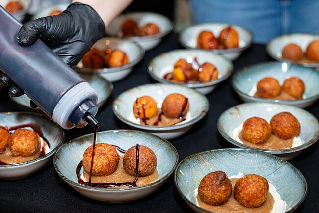 Desert: o combinație specială de papanași cu dulceață locală și piure de mere coapte cu crumble de nucă dulce-sărat, inspirată din servirea specifică ardelenească, de la Axente Sever. Desertul a fost realizat de Andreea Jugănaru, trainer Horeca School și blogger de food, alături de maistrul bucătar Tudor Mihalache.