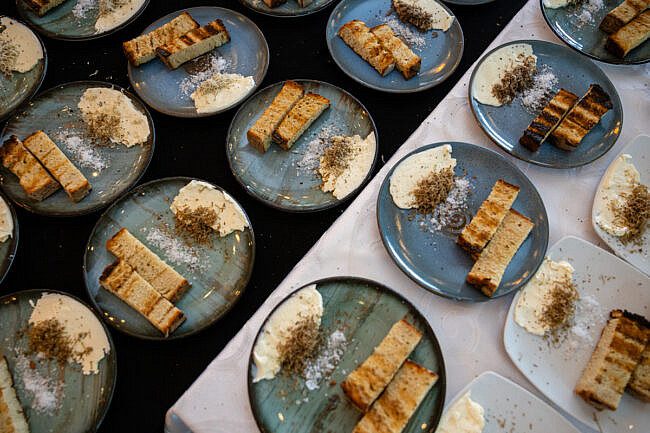 Aperitiv rece: unt de casă realizat chiar în cadrul workshopului de cooking, sub coordonarea chef-ului Liviu Lambrino, servit cu scalii de trufă proaspătă românească și pâine din Harghita, prăjită pe jar.