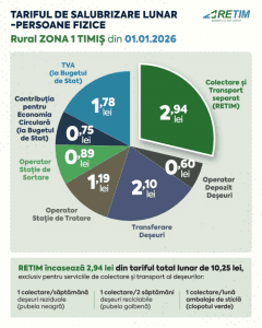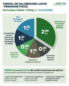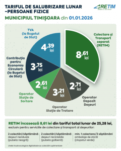 RETIM Ecologic Service S.A. informeaza toti utilizatorii serviciului de salubrizare (persoane fizice, asociatii de proprietari/locatari, persoane juridice si institutii publice), Zona 1 Timis, cu privire la modificarea tarifelor de facturare. Modificarea este determinata de ajustarea tarifelor de colectare si transport din Zona 1 Timisoara, aprobata prin Hotararea AGA a Asociatiei de Dezvoltare Intercomunitara Deseuri (ADID) Timis nr. 5/20.01.2026.