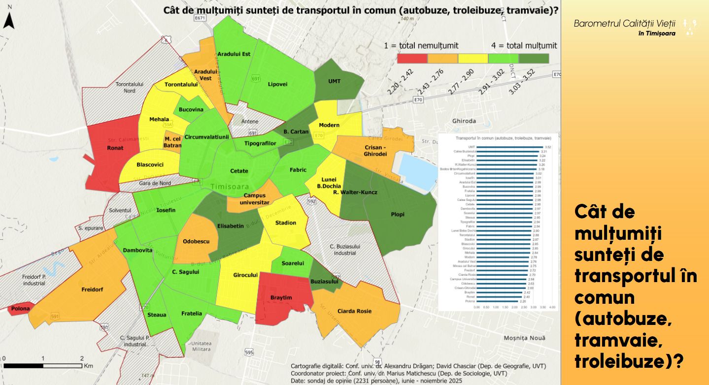 Barometrul Calității Vieții, la comanda Primăriei Timișoara, a fost realizat în perioada iunie-noiembrie 2025. Au fost consultați 2511 de timișoreni, dintre care 1319 față în față și 1192 online. Marja de eroare este de ±2%.