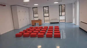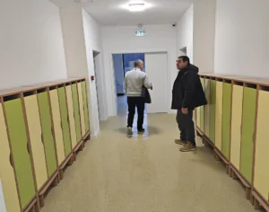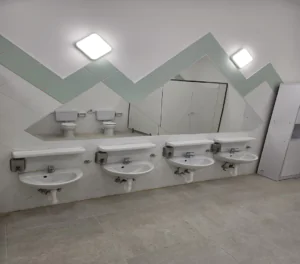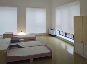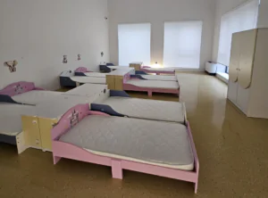 Clădirea cu fațadă multicoloră include săli de joacă moderne, dormitoare spațioase, o bucătărie complet utilată, spălătorie proprie, sală festivă pentru evenimente, cabinet medical, spații administrative moderne și un teren de joacă generos în aer liber.