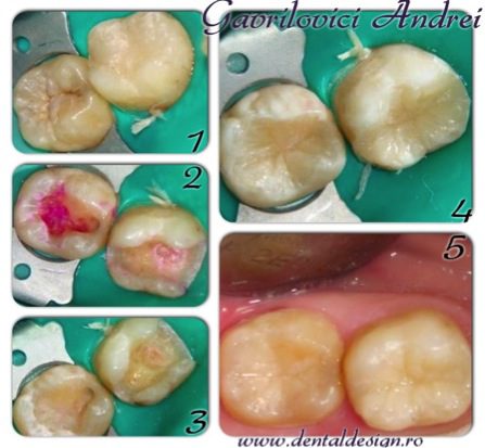 În colajul de mai sus observăm două elemente extrem de importante atunci când vorbim de o obturație realizată corect: diga dentară prezentă în primele patru imagini care ne ajută să menținem o izolare perfectă și revelatorul de carie (imaginea 2) fără de care nu putem fi siguri că am îndepărtat țesutul carios în întregime. Urmează tratarea infecțiilor din os prin refacerea tratamentelor de canal necorespunzătoare.