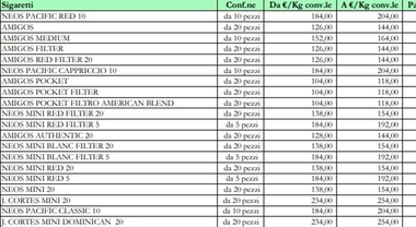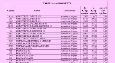 Ecco il listino dei nuovi prezzi dei tabacchi lavorati da domani in tabaccheria.