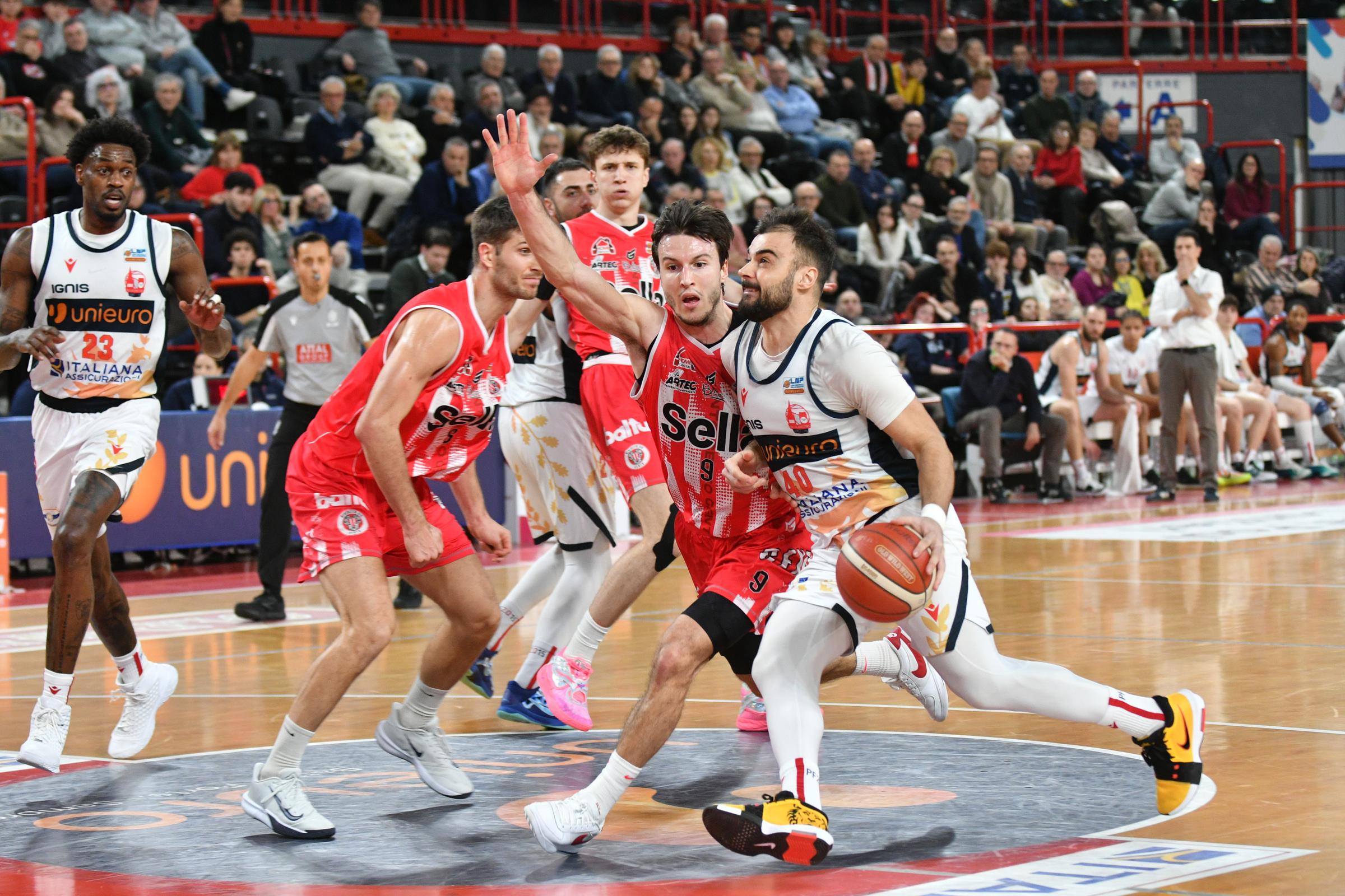 La Sella trova però nuovo vigore dopo la pausa lunga: l’Unieuro non segna e Tiberti (50-57) e Conti (56-63) marcano presto il nuovo allungo. Forlì resta a galla (61-63), ma Montano e Tanfoglio dalla distanza mettono le ali agli ospiti (66-74). I padroni di casa non si disuniscono e siglano un 9-2 dalla lunetta che rimette tutto in piedi (78-78, -3’30”), poi rivedono la luce con Aradori (85-83, -1’13”). Nel finale, dopo il gioco da tre punti di Devoe (87-88, -23”), è decisiva la bomba di Pepe.