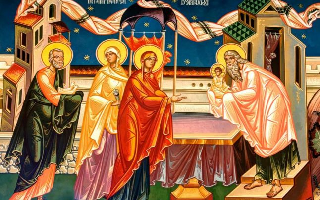 Conform scrierilor teologice, Întâmpinarea Domnului este prăznuită la 40 de zile de la naşterea lui Hristos, pe 2 februarie. Mântuitorul este dus la Templu de Fecioară Maria şi dreptul Iosif pentru împlinirea Legii, care prevedea că orice întâi născut de parte bărbătească să fie afierosit lui Dumnezeu în a 40-a zi de la naştere. În acest moment se făcea şi curăţirea mamei. În Templu sunt întâmpinaţi de dreptul Simeon şi proorociţa Ana.