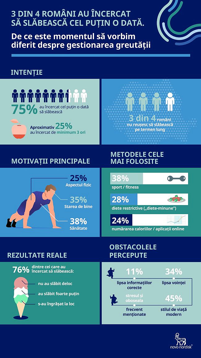 În fiecare început de an, slăbitul se află constant în topul rezoluțiilor românilor. Un nou sondaj realizat la nivel național, la inițiativa Novo Nordisk, arată că aproape 75% dintre respondenți au încercat cel puțin o dată să slăbească, iar 23% dintre aceștia au trecut prin minimum trei astfel de încercări de-a lungul timpului.