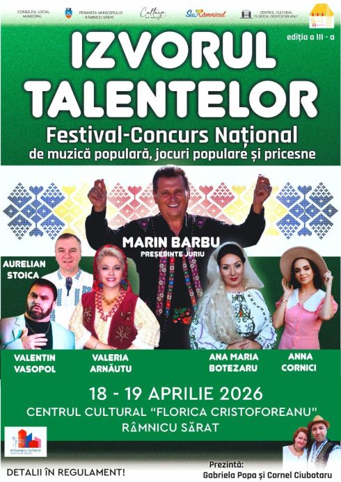 Cea de-a treia ediție a Festivalului Concurs Național de Muzică Populară, Jocuri Populare și Pricesne – Izvorul Talentelor, organizată la Râmnicu Sărat, de către primărie și Centrul Cultural ,,Florica Cristoforenu,, îl va avea în postura de președinte al juriului pe Marin Barbu.