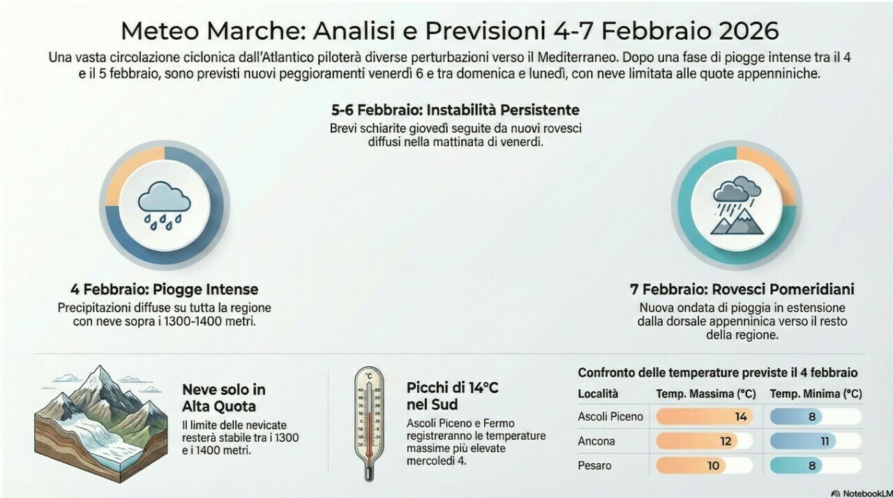 Tutt’altro scenario meteo ci attende in questa prima settimana di febbraio, segnata sulle Marche dall’influsso di correnti umide ed instabili che arrivano dall’Atlantico. Nella giornata di oggi, martedì 3 febbraio, le perturbazioni riusciranno in parte a superare la barriera degli Appennini e le precipitazioni torneranno a bagnare le Marche. “L’ondata di fenomeni attesa per oggi si accentuerà per poi esaurirsi nel corso delle prossime 24-36 ore”, si legge nel bollettino redatto da Danilo Tognetti del servizio meteo Amap. Ma la vasta circolazione ciclonica dislocata ad ovest della Gran Bretagna piloterà altre perturbazioni verso il Mediterraneo. “Altri peggioramenti sono dunque previsti per la nostra regione – scrive l’Amap -, uno venerdì 6 febbraio ed un altro tra domenica 8 e lunedì 9”. Le temperature tenderanno a non discostarsi troppo dalla media del periodo.