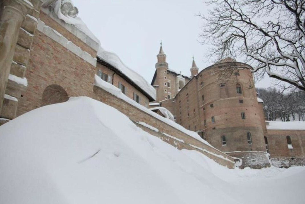 Scordatevi quella prima decade del febbraio di 14 anni fa, con le bufere di neve, il termometro sotto lo zero giorno e notte e persino le spiagge imbiancate in tutte le Marche, con accumuli che sottovento superarono i tre metri, non solo in montagna ma anche su quote collinari come ad Urbino (nella foto).