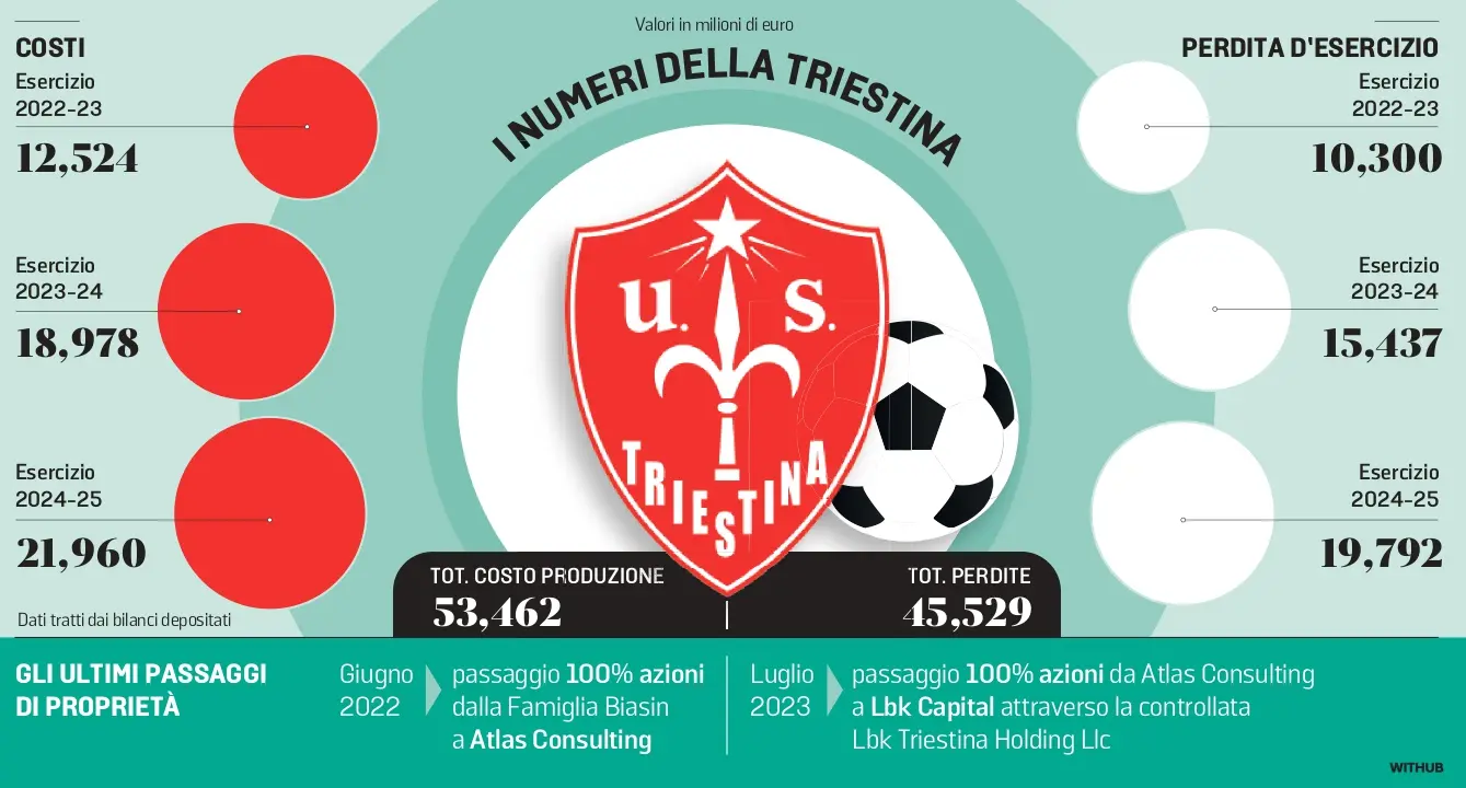 Negli ultimi due anni, con la gestione d’oltreoceano, le iniezioni di denaro si sono fatte ancora più cospicue: si parla di 40 milioni di euro. Un flusso, stando alle ipotesi investigative, contraddittorio rispetto alla situazione patrimoniale della Triestina Calcio che, nell’ultimo bilancio (chiuso al 30 giugno 2025) rendiconta una perdita di 19 milioni di euro. A questa cifra si sommano altri 40 milioni di perdite pregresse, gestite a bilancio grazie ai decreti legge emanati durante il Covid. Da un lato, dunque, la crisi di liquidità che ha fatto scattare penalizzazioni del Tribunale federale della Figc per mancato versamento degli emolumenti ai giocatori o per garanzie presentate mediante fidejussioni false; oltre alle inadempienze nel pagamento del canone annuale per la concessione dello stadio Rocco (il Comune di Trieste aspetta oltre 230mila euro).