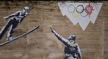Ritrae un agente dell’ICE, l’agenzia federale degli Stati Uniti per il contrasto dell’immigrazione, al centro delle polemiche per la sua presenza alle Olimpiadi, che spara a uno ski jumper e una montagna rovesciata con il logo dei Giochi, in cui il cerchio rosso si trasforma in un mirino.