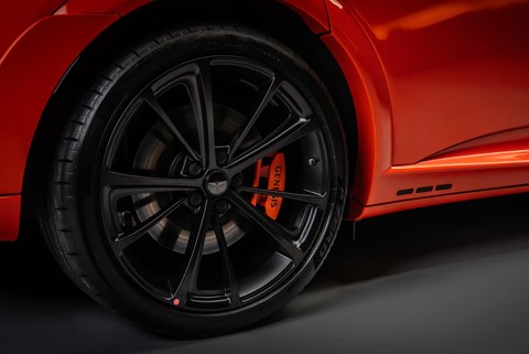 It’s a pretty wild thing. Naturally, it uses the regular GV60 as a base but adds an aggressive bodykit. The front is beefier, but the rear gets some sporty treatment too. There’s a new rear wing which produces actual downforce and is shaped as like it has a pair of horns at the ends, and you get more black accents and a lower diffuser to finish of the new Magma’s stance. The new bodykit enables a 50mm increase in track width and a 20mm lower ride height. Forged 21-inch wheels wearing Pirelli P Zero Elect tyres are standard.