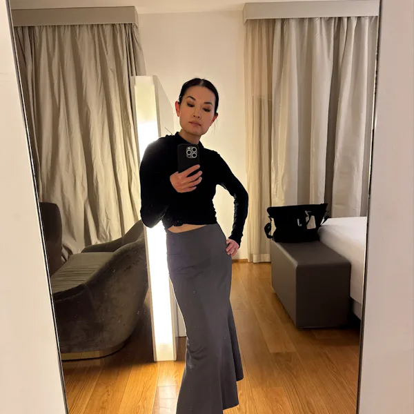 Look: I really am a minimalist at heart. I’ll never deviate from clean silhouettes and neutral colors because I hate being restricted or weighed down by fashion. (The irony — a fashion editor who doesn’t like to think about what she has to wear!) For the second day, I went with a basic hoodie sweater, my favorite Calvin Klein Collection skirt from the 2000s, and Max Mara boots, the best heeled boots that I’m able to walk quickly in. The skirt is one my most treasured pieces that comes in and out of rotation every couple of years. The fit is flawless, and its versatility allows me to wear it to work or an evening event.