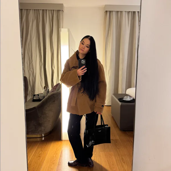 Look: A low-key ensemble for a very jet-lagged individual. Fresh off of a red eye, I’m the kind of girl who needs multiple hours to gather her wits about her: hotel analysis, review of my schedule for the week, coffee, shower, more coffee. My vibe is very minimal, clean, and tailored to a New York working woman since I’m always on the go. For my first day, I wore my cozy Miu Miu coat, Levis jeans, Bass Weejun loafers, and my beloved Prada Re-Edition 1995 Carolyn Bag.