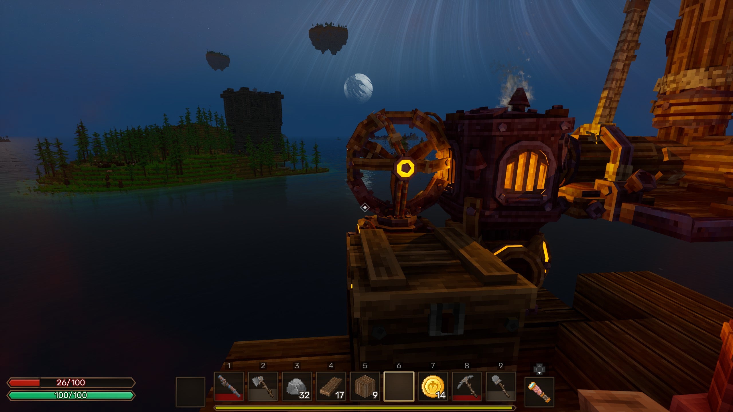 There’s minimal detail on the blocky islands until you’re right up close, and the sea, devoid of life, is just a flat blue plane. Even with its fancy nighttime skyboxes – huge ringed planets with shattered surfaces looming overhead – there are few distractions; certainly while your airship remains little more than a flying plank. I suppose the void of travel might be more easily filled with a co-op friend in tow, and there’s promise of air combat too – but they’re things I haven’t yet been able to try. I’m also not convinced Everwind’s procedurally generated islands currently feel different enough, interesting enough, rewarding enough – beyond a biome change and some striking landmarks – to make the lengthy journey feel earned.