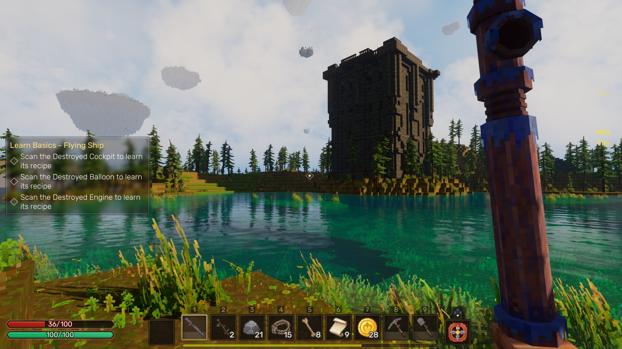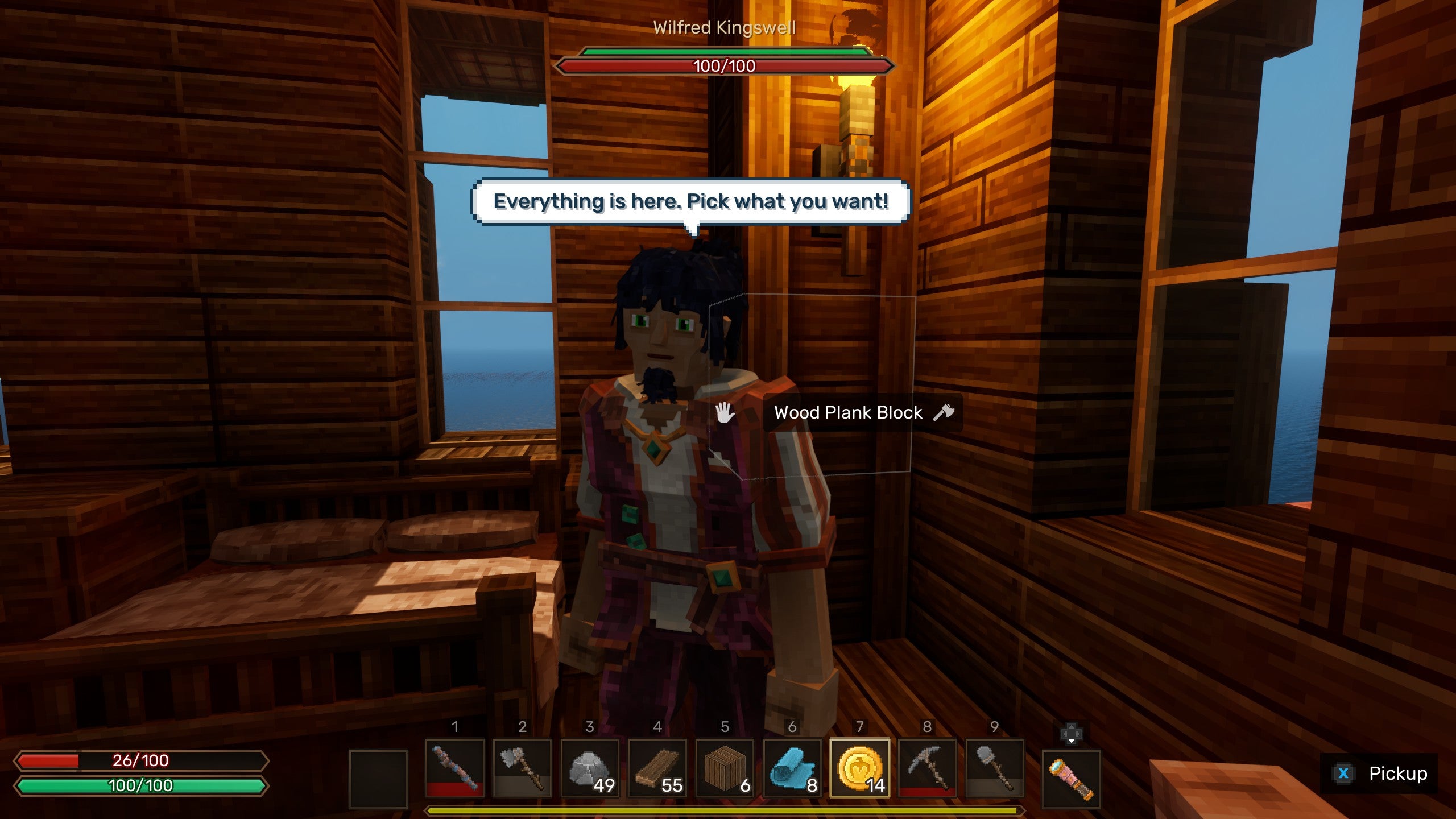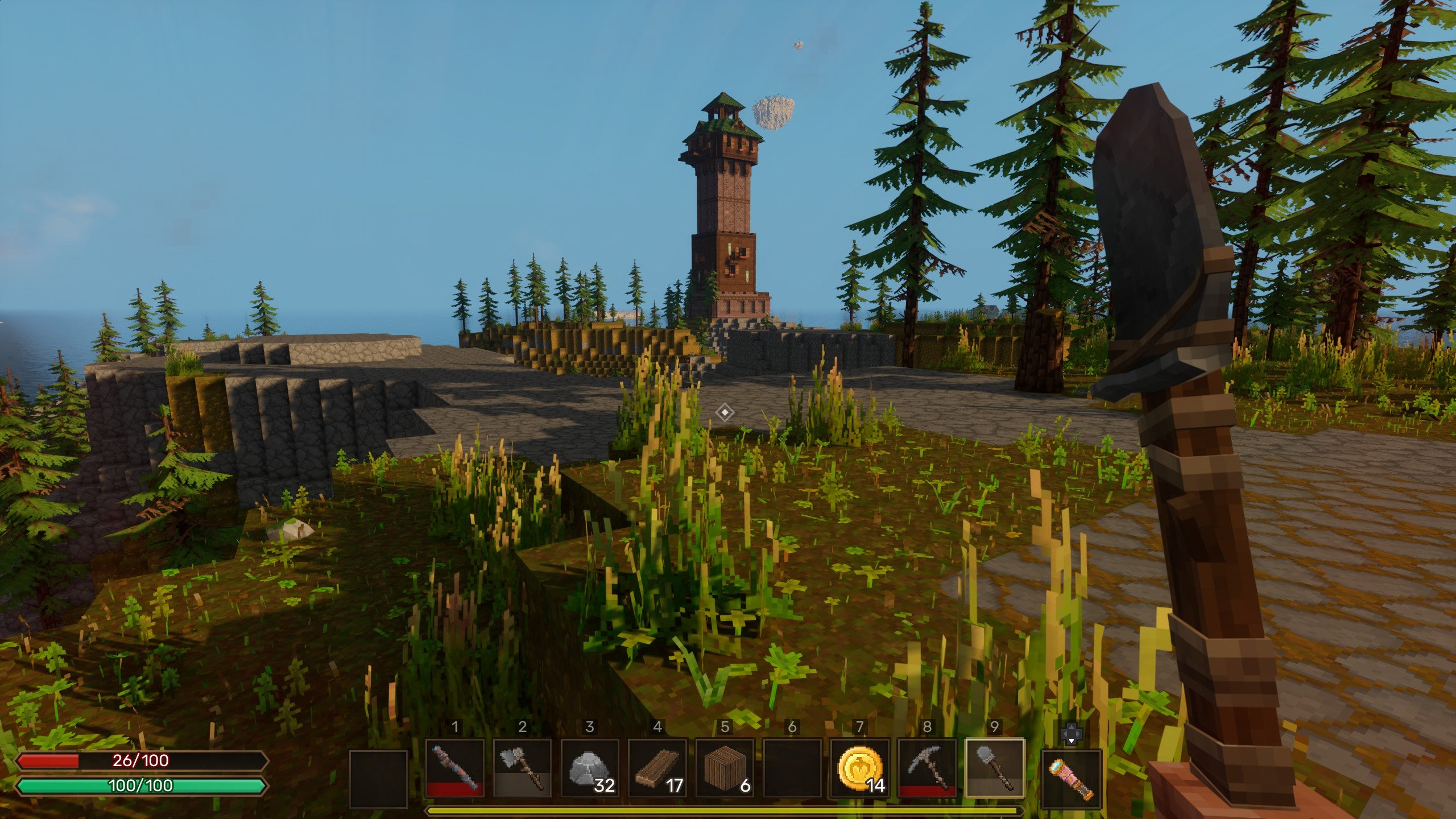 But those familiar bits are undoubtedly familiar. This is a game of sandbox survival, of scavenging and crafting, set in a procedurally generated world built from destructible voxel blocks. You punch things, you farm things, you fill your pockets with endless stuff, and you do all this to feed machines capable of turning your old stuff into different stuff – so you can craft weapons, armour, tools, furniture, and more. If you’re even passingly familiar with Minecraft, you’ll know the fundamentals already – and aesthetically, its muted, vaguely medieval fantasy vibe brings Hytale to mind. It looks nice though! Its landscapes are alleviated above basic blockiness by some striking lighting, and by a liberal scattering of props, rich foliage, and diverse fauna – from boars and meandering fowl to lobster-things with barrels for shells. And when I found the capybaras on my starting island, I was thrilled!