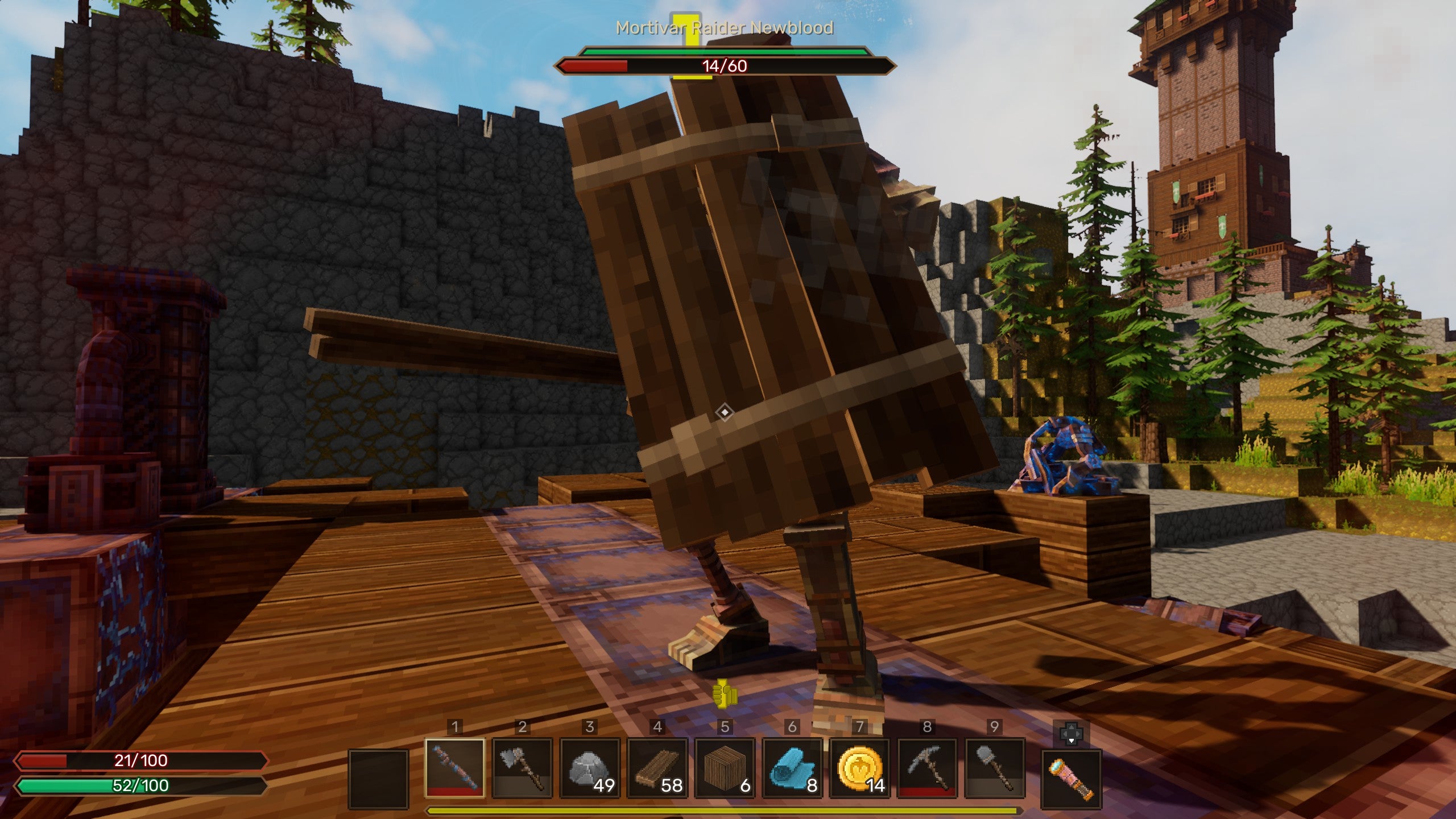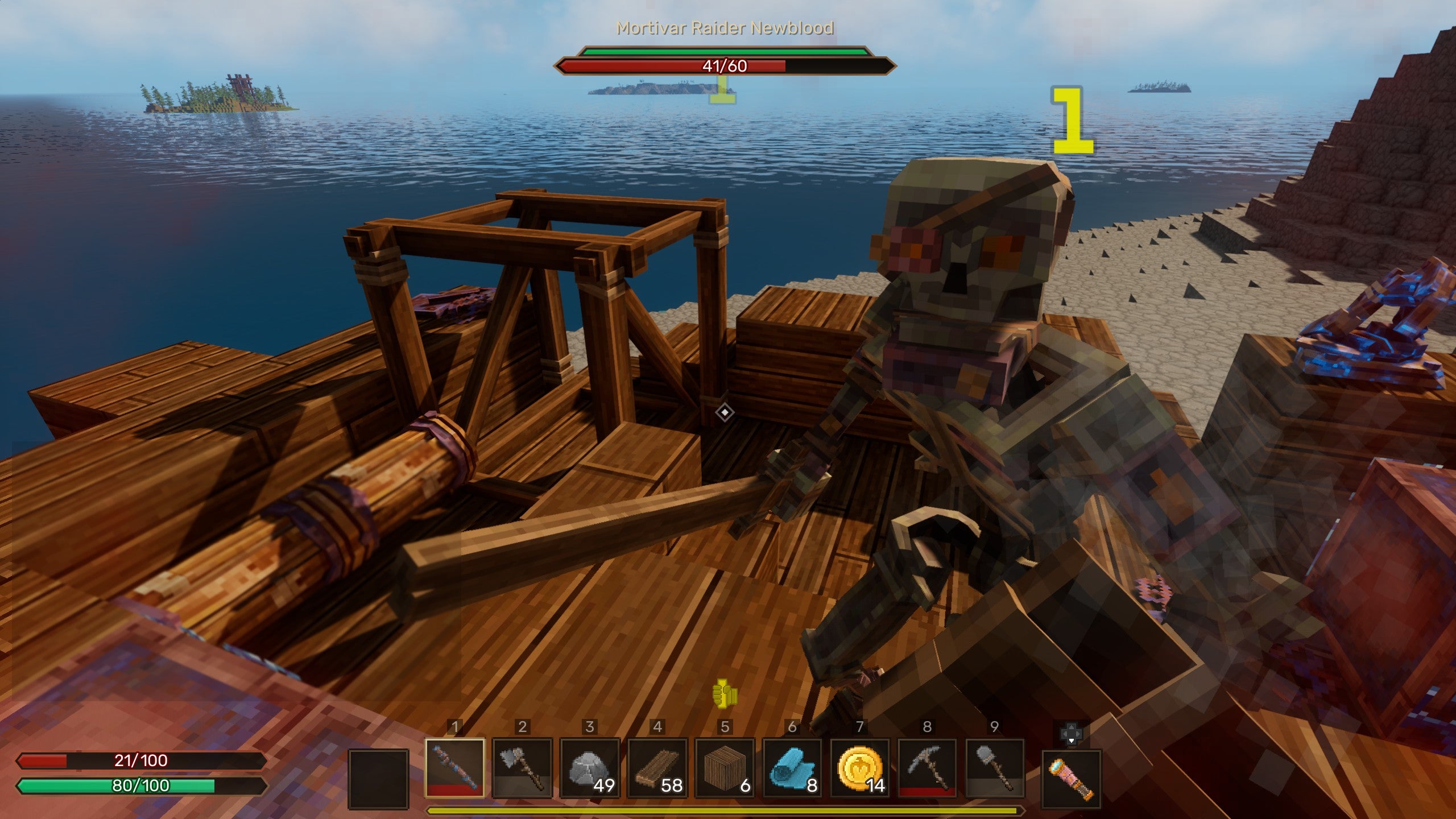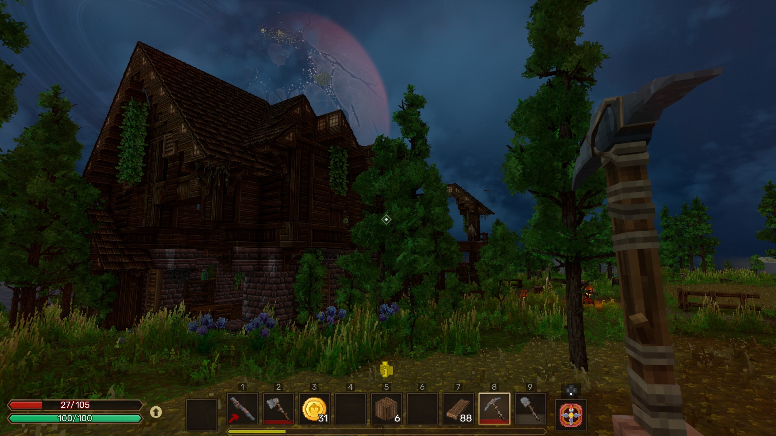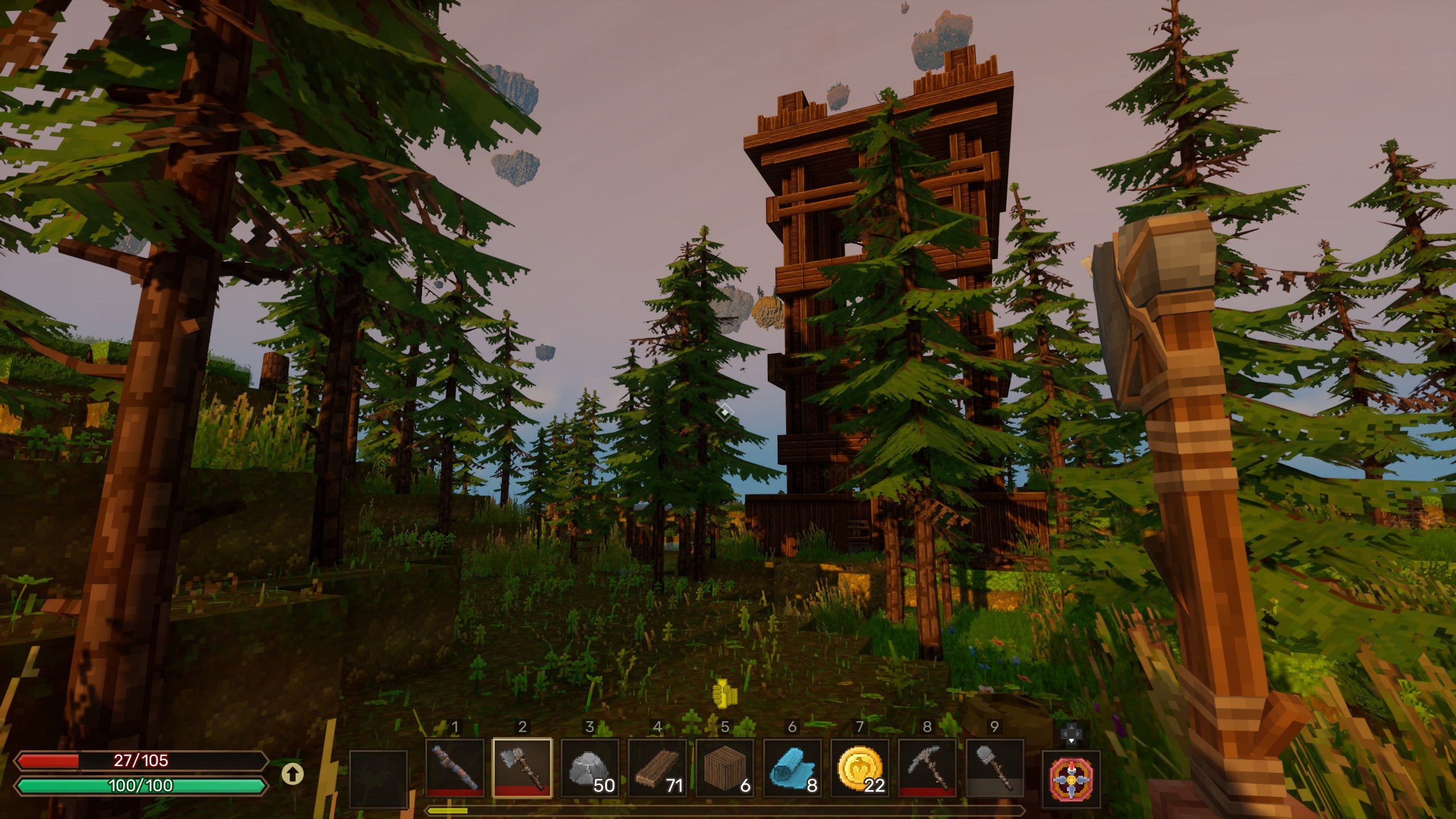 But those familiar bits are undoubtedly familiar. This is a game of sandbox survival, of scavenging and crafting, set in a procedurally generated world built from destructible voxel blocks. You punch things, you farm things, you fill your pockets with endless stuff, and you do all this to feed machines capable of turning your old stuff into different stuff – so you can craft weapons, armour, tools, furniture, and more. If you’re even passingly familiar with Minecraft, you’ll know the fundamentals already – and aesthetically, its muted, vaguely medieval fantasy vibe brings Hytale to mind. It looks nice though! Its landscapes are alleviated above basic blockiness by some striking lighting, and by a liberal scattering of props, rich foliage, and diverse fauna – from boars and meandering fowl to lobster-things with barrels for shells. And when I found the capybaras on my starting island, I was thrilled!