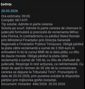 „Admite in parte cererea de chemare in judecata formulata si precizata de reclamanta Mihoc Iulia Florica, in contradictoriu cu Statul Roman. Obliga paratul la plata catre reclamanta a sumei de 3.500 de euro in echivalent in lei la cursul BNR de la data platii, cu titlu de daune morale”, se mentioneaza in Hotararea 446/2026 din 20.03.2026. Cu drept de apel in 10 zile de la comunicare.