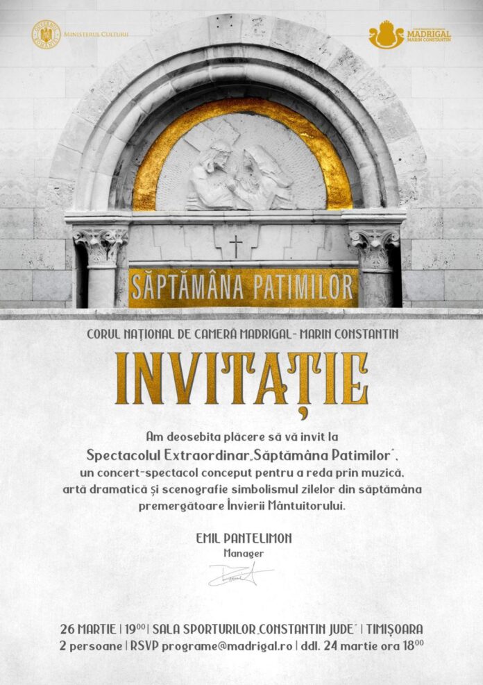 Spectacolul Extraordinar „Săptămâna Patimilor” al Corului Național de Cameră „Madrigal – Marin Constantin”, dirijat de Anna Ungureanu va avea loc joi, 26 martie 2026, ora 19:00, în Sala Sporturilor Constantin Jude din Timișoara.