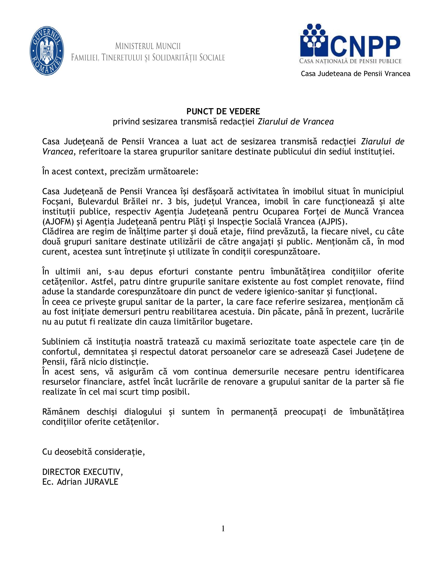 Sâmbătă 21 martie 2026 ora 17:25 direcrorul Casei Județene de Pensii Vrancea, Adrian Juravle ne-a transmis următorul punct de vedere scris la sesizarea cititorului Ziarului de Vrancea