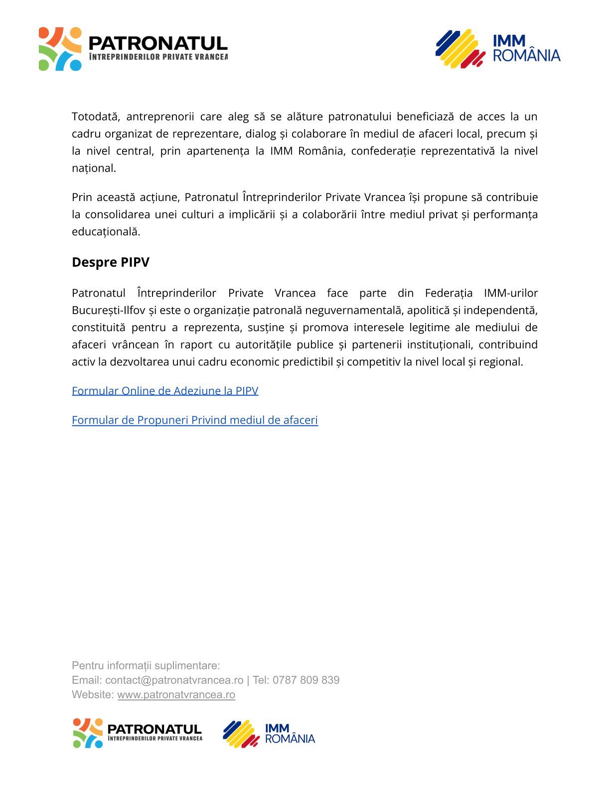 În același timp, antreprenorii care aleg să se alăture patronatului beneficiază de acces la un cadru organizat de dialog, colaborare și reprezentare, inclusiv la nivel național prin IMM România.