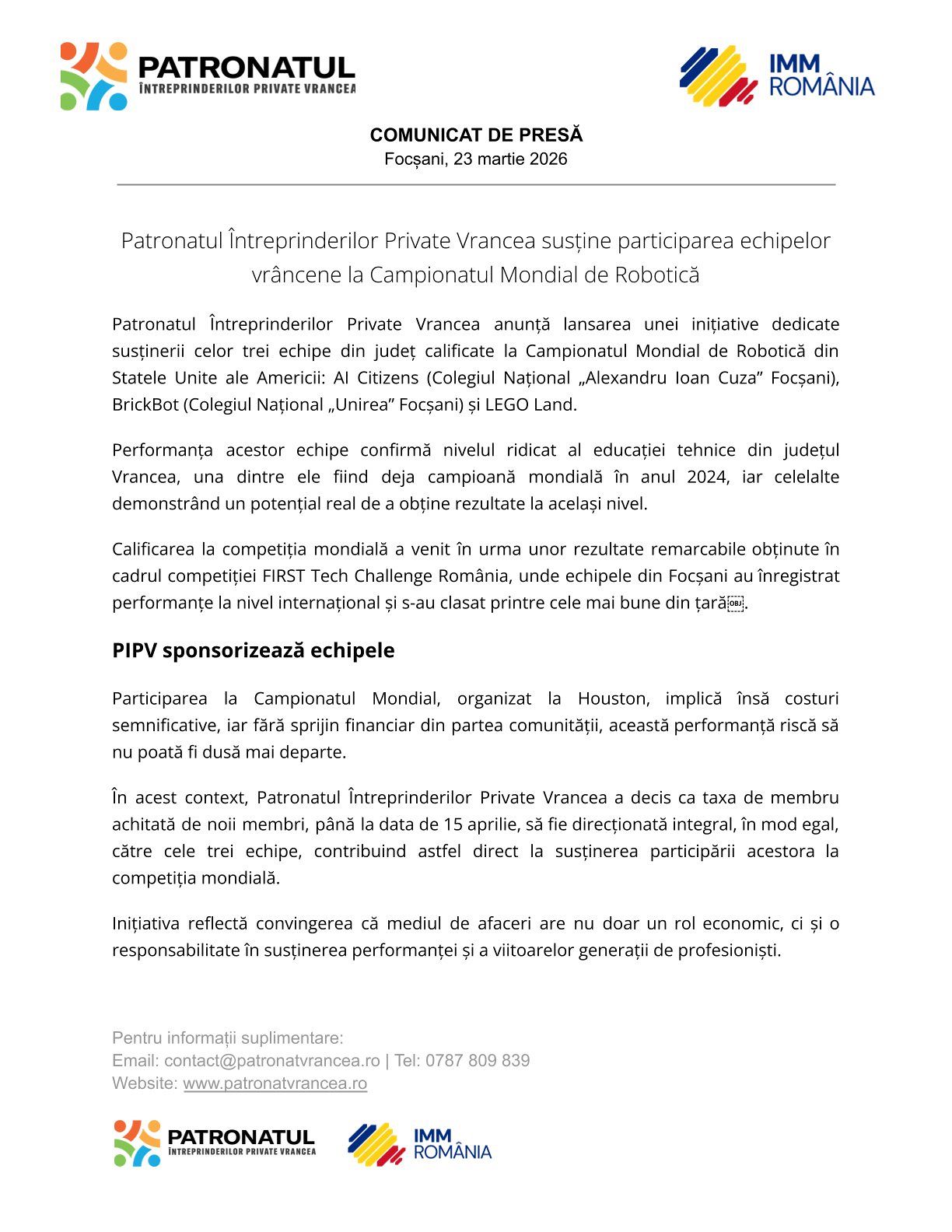 Citiți și conținutul integral al comunicatului de presă transmis redacției Ziarului de Vrancea duminică 22 martie 2026 ora 17:04 de Patronatul Întreprinderilor Private Vrancea în legătură cu această știre