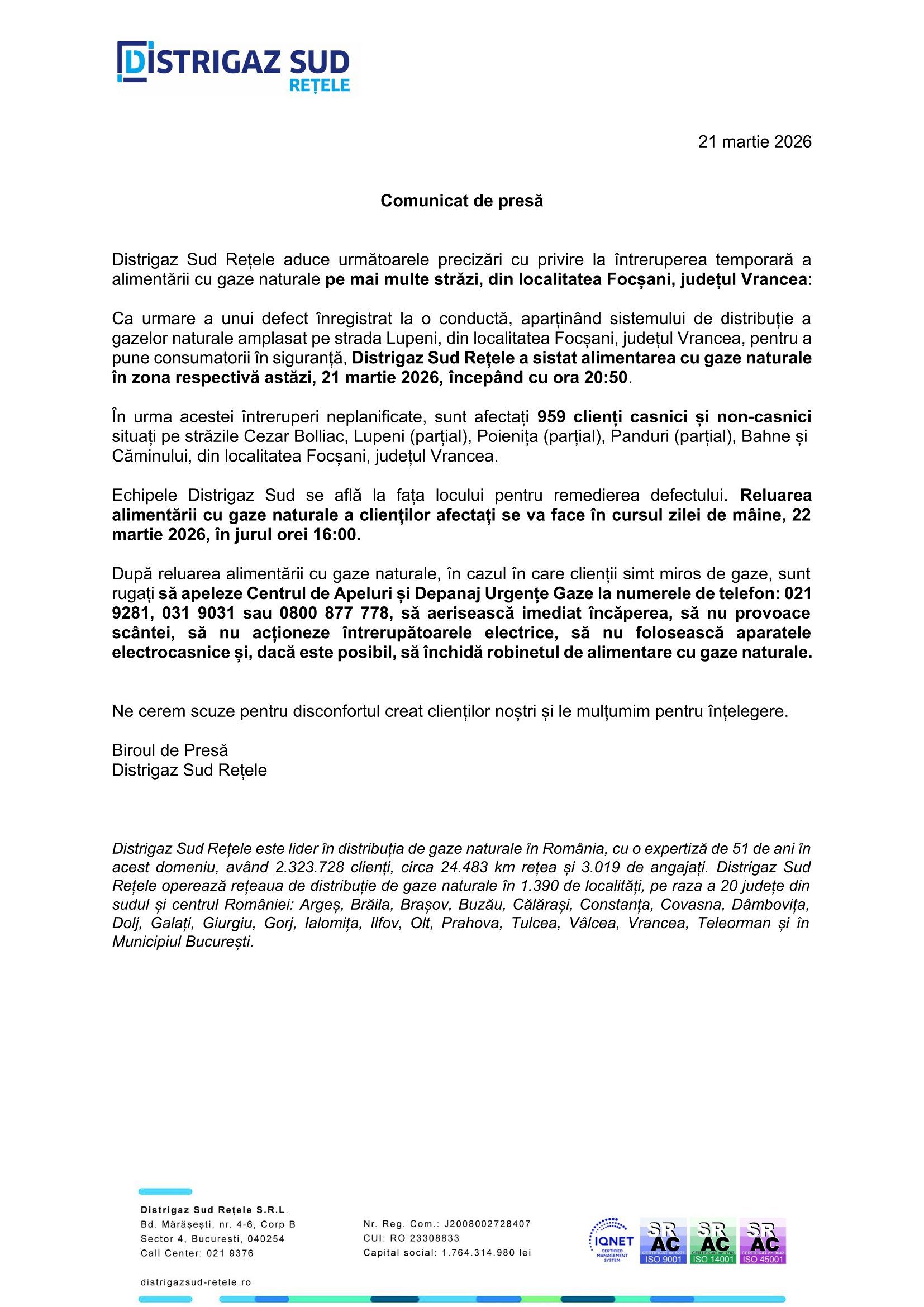 Citiți în continuare și conținutul integral al comunicatului de presă transnis redacției cotidianului nostru sâmbătă 21 martie 2026 ora 23:51, de Biroul de presă al Distrigaz Sud Retele în legătură cu această știre
