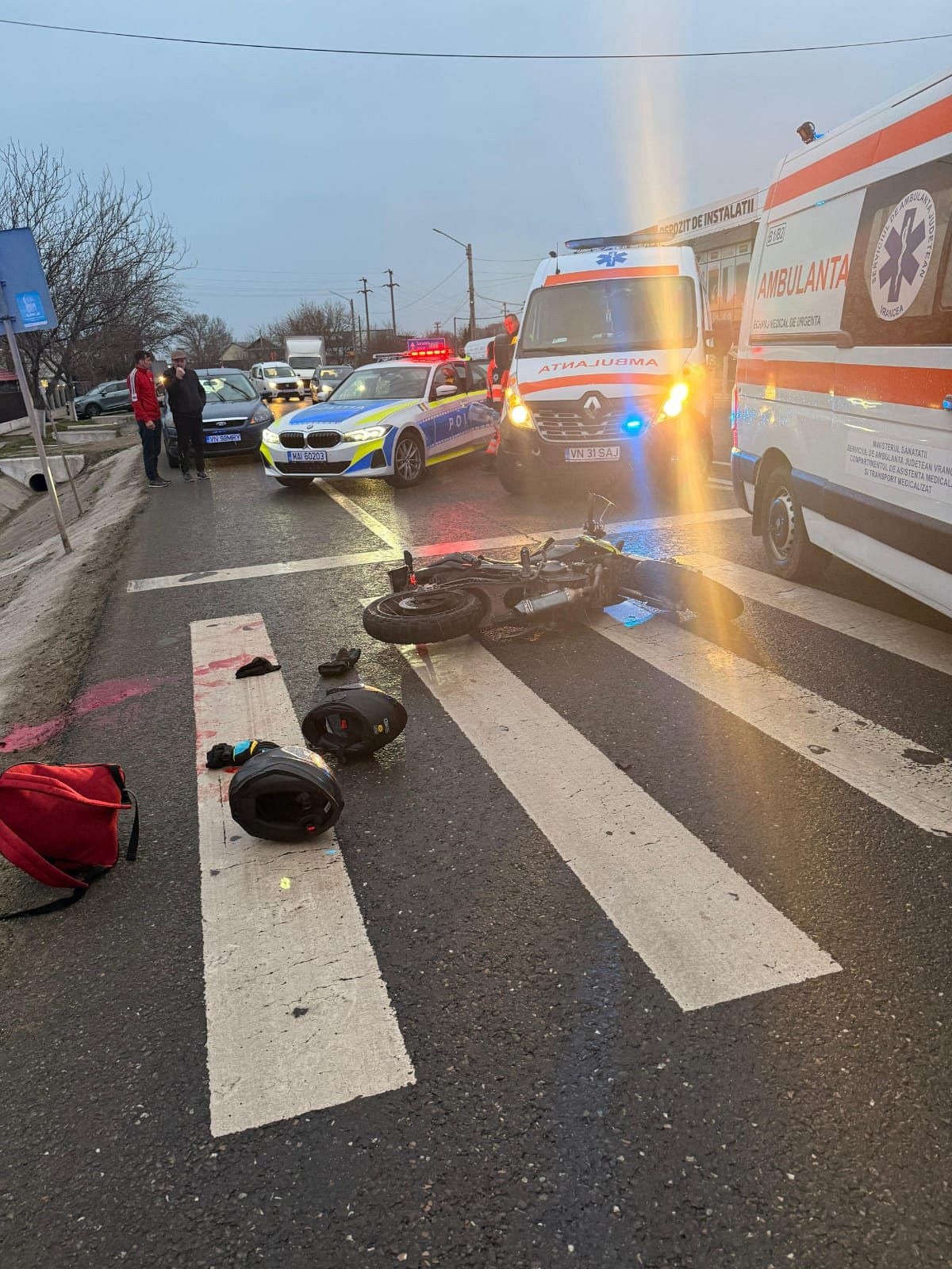 Informarea de presă actualizată, sâmbătă 21 martie 2026, ora 19:09, SERVICIUL DE AMBULANȚĂ JUDEȚEAN VRANCEA :Accident rutier între o motocicletă și un autoturism, produs pe DN2 – E85, în localitatea Golești.Serviciul de ambulanță județean Vrancea, vă informează cu privire la o intervenție medicală de urgență, desfășurată astăzi 21.03.2026, în jurul orei 18:00, pe DN2 – E85, în localitatea Golești, în urma unei coliziuni între un autoturism și motocicletă. Dispeceratul SAJ 112, a mobilizat imediat două echipaje de intervenție, inclusiv o ambulanță cu medic, pentru a acorda asistență medicală persoanelor rănite. La fața locului au fost identificate două victime conștiente, prezentând politraumatisme prin accident rutier, rezultate în urma impactului. Conducătorul motocicletei un adolescent de 18 ani, a fost găsit în stare critică, prezentând politraumatism prin accident rutier cu fractură deschisă de membru inferior drept. Pasagerul motocicletei, un adolescent de 17 ani, a doua victimă, a fost evaluată prezentând șoc traumatic și un traumatism minor membru inferior.