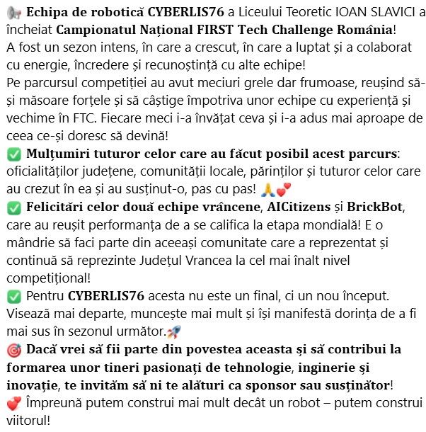 Echipa de robotică CYBERLIS76, reprezentând Liceul Teoretic „Ioan Slavici” Panciu, a încheiat participarea la Campionatul Național FIRST Tech Challenge România 2026, lăsând în urmă nu doar rezultate competitive, ci și un exemplu remarcabil de fair-play, respect și spirit de comunitate.