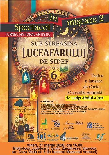 Potrivit unui comunicat transmis redacției Ziarului de Vrancea de către Biblioteca Județeană „Duiliu Zamfirescu”, publicul este invitat la spectacolul „Sub streașina Luceafărului de sidef”, o creație artistică semnată de Latip Abdul-Cair — actor, poet și regizor, membru UNITER.