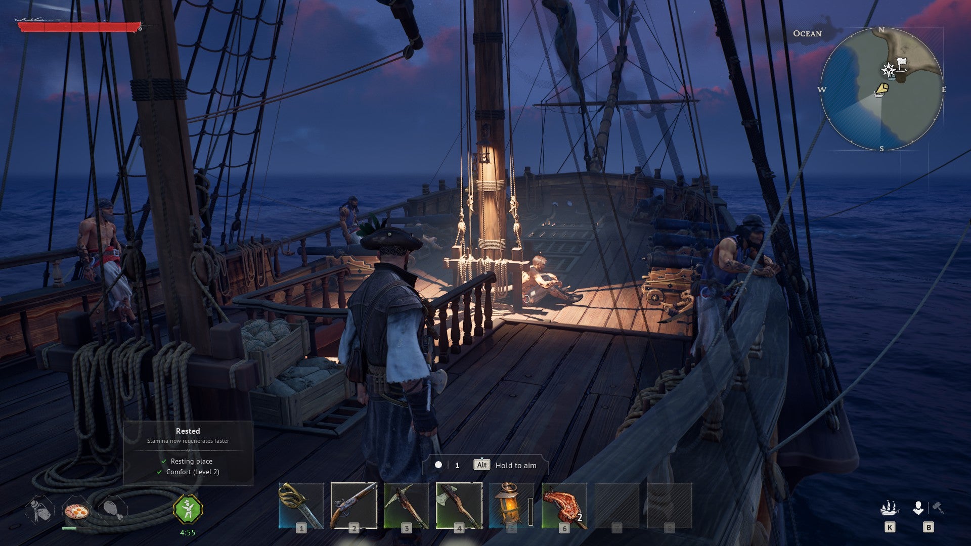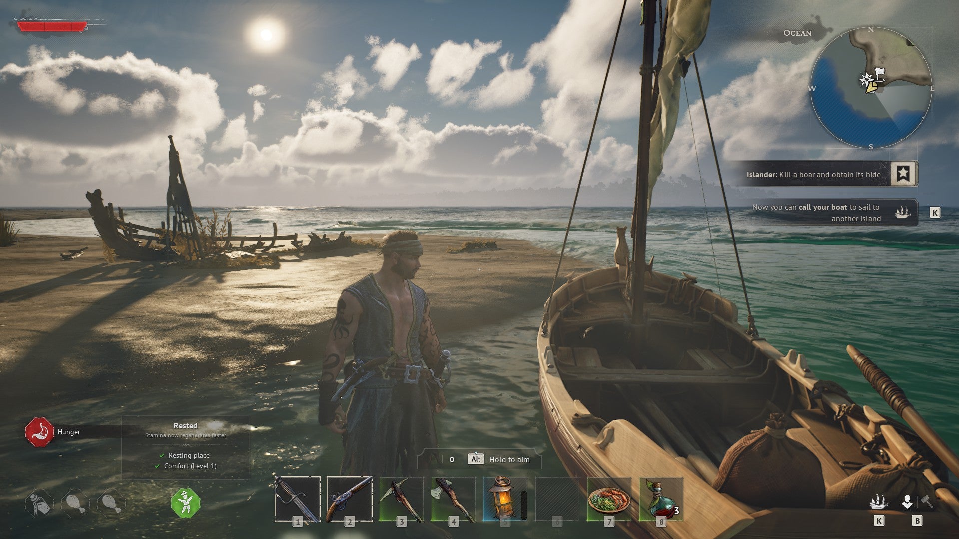 It helps, too, that your leisurely exploratory meandering is given more propulsive focus through Windrose’s overarching narrative goals, the demo gradually guiding you back from the brink of death toward the first throes of oceanbound piracy. Once the tutorial bits are out the way, you’re given a puny sailboat, opening up the wider archipelago where you’ll search for kidnapped crewmates and restore wreckage on neighbouring islands.