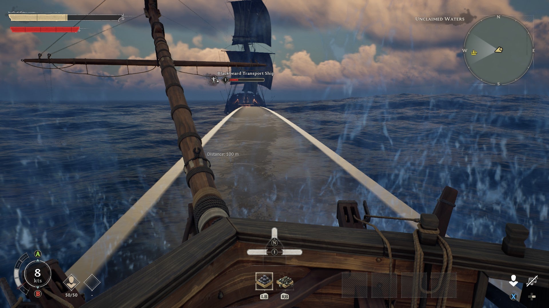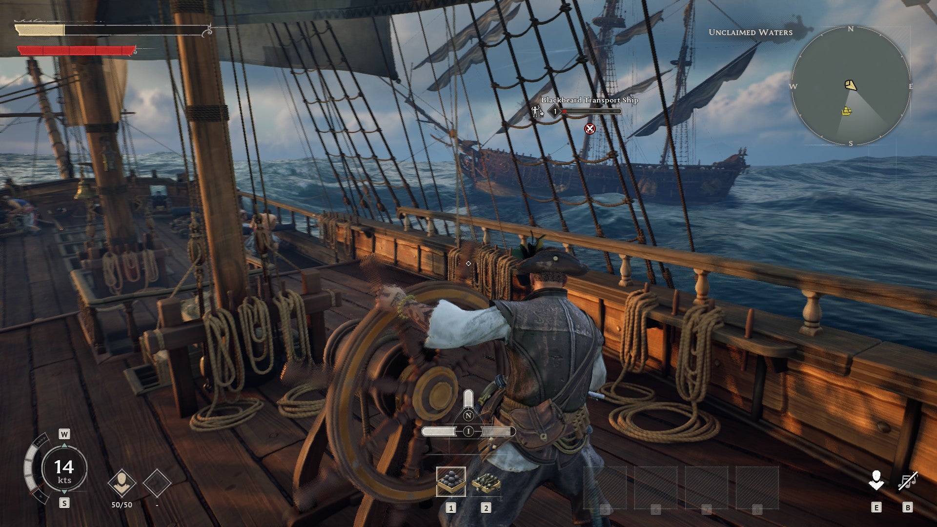 Quite a lot of the time, Windrose feels like an action game, and a slickly enjoyable one at that. You’ll bound through the thick jungle undergrowth in search of adventure, fighting off (or more likely fleeing from, in the early hours) perpetually peeved wildlife and, when night falls, decidedly more supernatural forces. You’ll loot ancient ruins or infiltrate pirate encampments, explore underground tombs and labyrinthine caves – all placed according to the whims of Windrose’s procedural generation, which does a good job of creating a convincingly natural open-world archipelago. As you go, you’ll uncover snippets of lore, challenge patrolling enemies, and perhaps even aquire some exotic (and useful) treasures. The demo might be pulling from a limited pool of premade pieces, but it still manages to conjure a compelling sense of discovery. And it’s paired with some tricky but tautly satisfying third-person combat; a kind of rhythmic Soulsian affair that delivers a pleasingly weighty mix of stamina-depleting swings, dodges, and parries. Oh, and there’s obviously sailing too. But we’ll get to that.