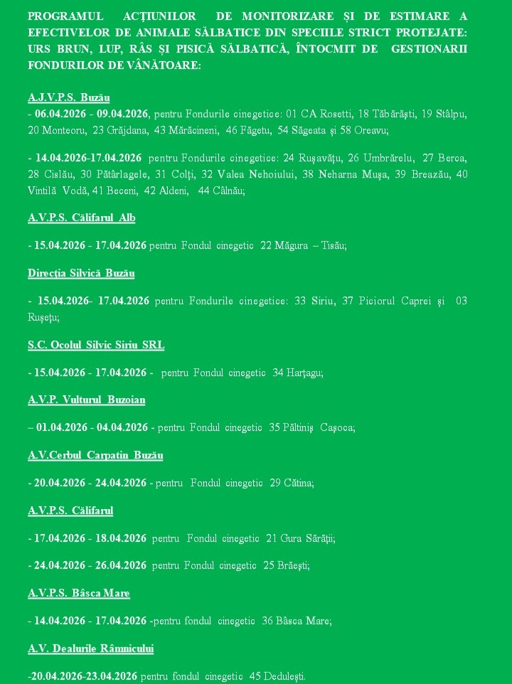 Rezultatele finale ale acţiunilor de monitorizare și estimare a efectivelor de animale sălbatice, din speciile strict protejate, realizate în fiecare fond cinegetic din județul Buzău, vor fi publicate la începutul lunii iunie 2026”, anunță Direcția Județeană de Mediu Buzău.