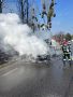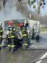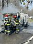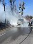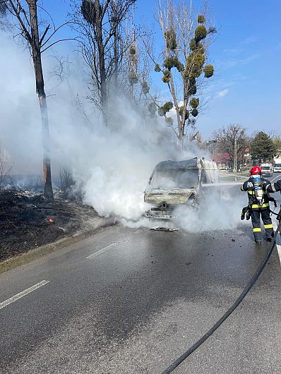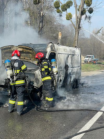 Autospecială SAJ Bacău distrusă de incendiu la Strunga. Intervenție rapidă a pompierilor – trafic blocat și vegetație cuprinsă de flăcări