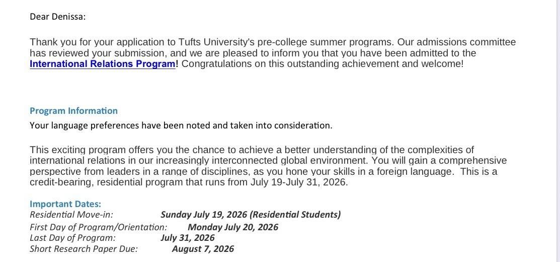Potrivit informațiilor obținute de redacția Ziarului de Vrancea, Denissa-Emanuela Lăbunț a fost acceptată oficial în cadrul programului preuniversitar de vară „International Relations Program”, organizat de Universitatea Tufts.